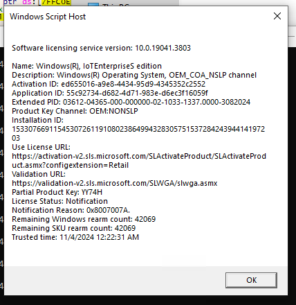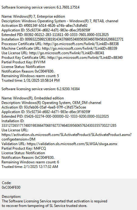 “7B296...”和文件似乎起着类似的作用,因为这些文件不仅被加密,而且似乎还包含某种哈希或签名。损坏或删除这些文件将卸载所有已安装的产品密钥并重置所有其他激活数据(重置计数、KMS 客户端计数等)。在 Windows 7 上,它还会显示以下可爱的错误消息:data.dat