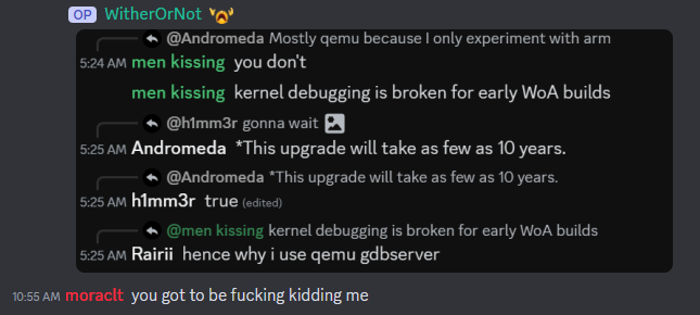 因此,尽管我有一个完全去混淆的 spsys 副本,没有任何烦人的反调试功能,但我几乎没有实际调试它的选项。由于此版本是在 QEMU 中模拟的,我仍然可以选择使用其内置的 GDB 调试服务器,但这将非常难以使用,因为我必须在内存中手动定位内核和驱动程序才能执行任何有用的作。幸运的是,我能够与 Rairii 取得联系,由于他在 ARM 上模拟早期 Windows,他对这种调试方法更加熟悉。