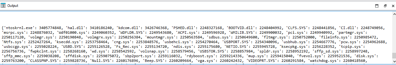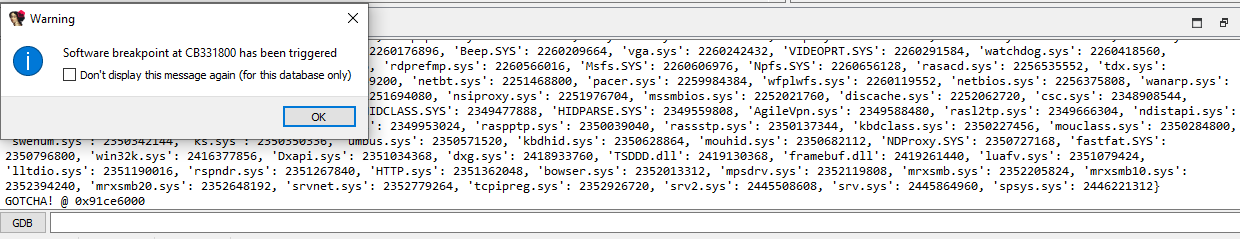 是的,对于调试内核或调试 QEMU(或者真的任何东西)来说,它是最不“合适”的选择,但对我来说更重要的是我熟悉它。使用我从内部版本 7915 的符号集中抓取和修改的各种内核结构,我能够编写出一个脚本,该脚本将在各种内核函数上断点并获取重要数据,例如内核基址和加载的内核模块列表。通过以编程方式中断 ,我甚至可以在加载每个驱动程序时自动更新模块列表。IopLoadDriver