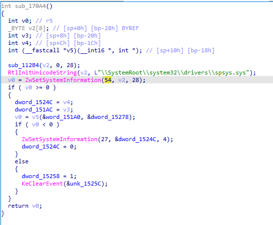 然而,即使有了这个监控系统,我仍然无法捕捉到加载的时刻。只有在检查了其加载程序的代码后,我才发现了一个有趣的调用:spsys.sysspldr.sysZwSetSystemInformation