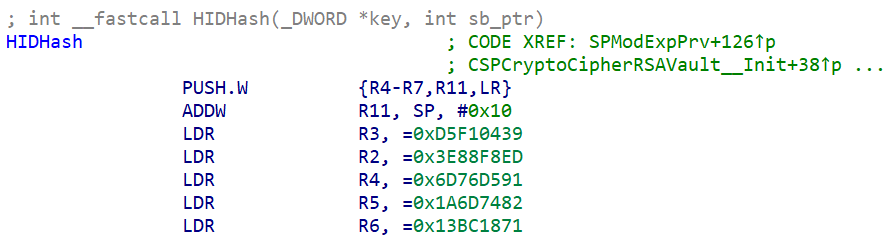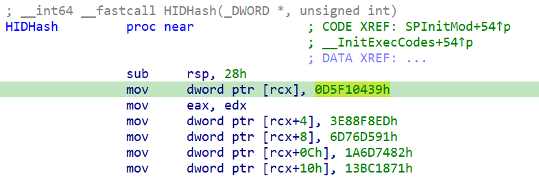 asdcorp 和 abbodi1406 立即开始工作,弄清楚数据格式以及其中存储的数据类型。与此同时,我专注于在 Windows 10 上复制这个技巧,在那里分析会容易得多,尤其是因为有一个实际的调试器 (x64dbg) 可用。方便的是,函数 HIDHash 中有一些非常独特的常量: