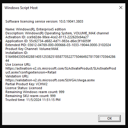如果安装了通用密钥,则需要运行以删除产品密钥的唯一 ID。这将阻止 WAT 在线验证密钥。安装虚假产品密钥将具有等效效果。或者,您可以使用非通用密钥绕过此检查,尽管 WAT 会阻止许多公开可用的密钥。TSforge.exe /duidTSforge.exe /igpk <activation id>