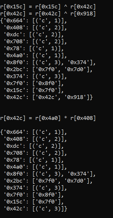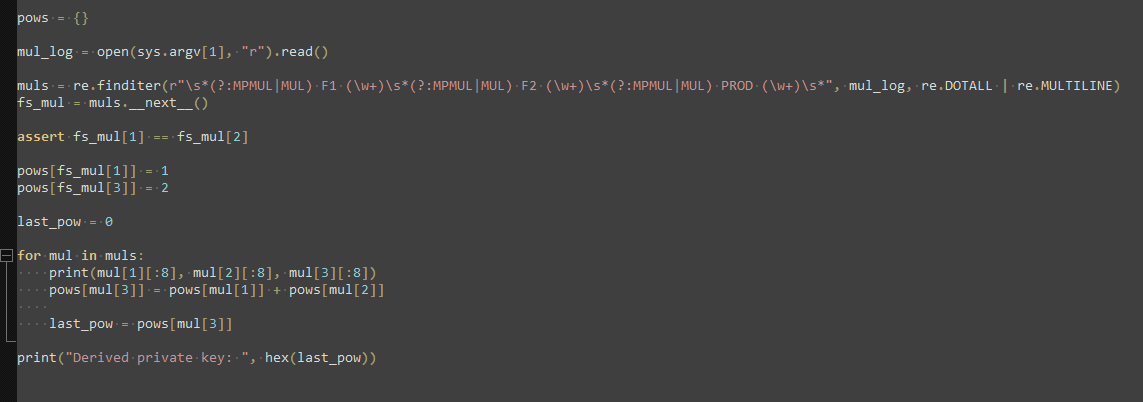 观察这个模拟的输出,我意识到所有这些混淆都掩盖了我以前隐约听说过的一种技术,称为加法链幂运算。经过一番思考,我意识到我可以跟踪和转储每个模乘法的输入和输出,并使用它来派生私钥。只需要 x64dbg 日志记录和几行 python: