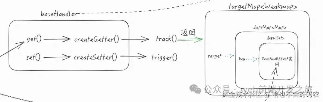 我们看到,createReactiveObject函数最终是会执行new Proxy生成一个proxy实例,如果不了解Proxy的同学可以自行去MDN[1]中学习,然后将这个proxy代理对象和target以键值对的方式建立联系,后续当同一个target对象再次执行reactive函数时,直接从proxyMap中获取,最终返回这个proxy代理对象。