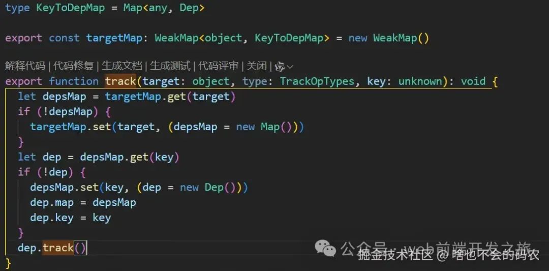 get函数中,除了返回一个`Reflect.get`[2]的结果,还调用了一个track函数,track函数的实现在packages\reactivity\src\dep.ts中: