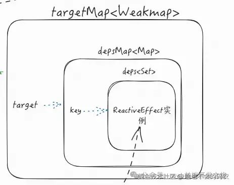 track函数的作用是收集依赖。它最终会构造一个类型为WeakMap[3]targetMap,其键是我们传入的那个target对象,值是一个Map[4]类型的depsMapdepsMap中存放的才是target对象keydep的对应关系。而dep中存放的就是收集到的依赖。这么说起来有点绕,直接上图: