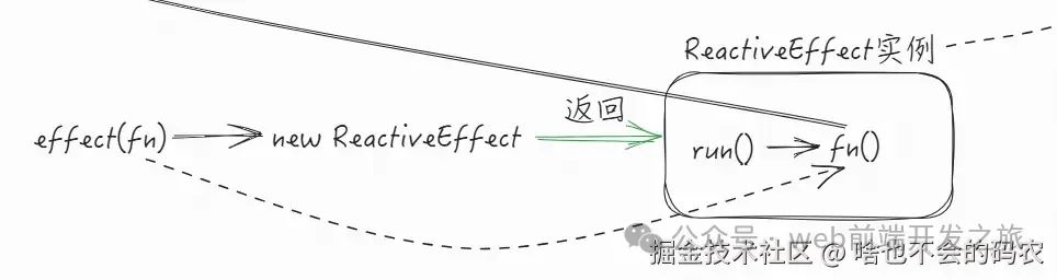 effect函数中,会调用一个ReactiveEffect构造函数生成ReactiveEffect实例,这个实例会作为依赖被收集。实例中有一个run方法,并且在run方法执行时会调用effect函数传入的参数,即,副作用函数。从而触发proxy代理对象中的get行为,将这个ReactiveEffect实例作为依赖收集到dep