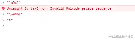 我们之前说过,UTF-16是Unicode的一种实现,Unicode的代理区 0xD800-0xDFFF, 其不代表任何字符。同理,我们采用\u + 四位十六进制方式,如果码点在这个区间,返回 或者原字符(浏览器不同,可能返回不同), 当然其他的码点也可能还没设定值或者是不可打印的。