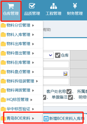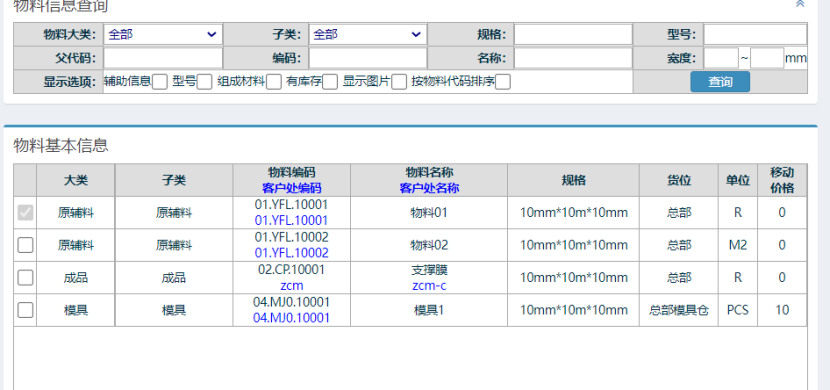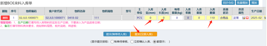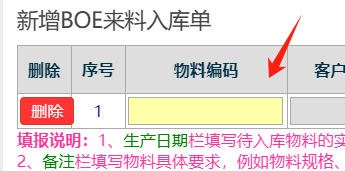 ![]() ![]() 点击进入 如下图: 1. 首先选择入库仓库 2. 然后点击,开始选择物料信息 ![]() 3. 在新窗口查询并选择,然后点中即可 ![]() 4. 点击”增加”,可添加多行,点击”批量增加”,可勾选增加, ![]() 5. 然后填写长,宽,数量,如果是非卷料直接填写数量即可,最后点击提交 ![]()