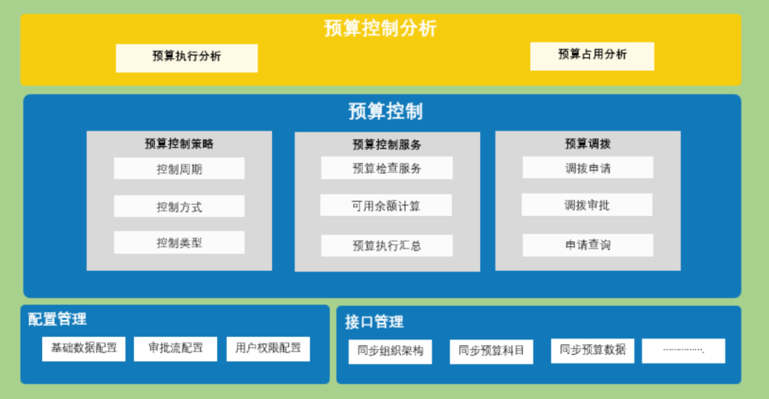 该系统包括预算控制策略子系统、预算控制服务子系统、预算调拨子系统,以及配置管理模块、接口管理模块、预算控制分析模块等组成部分。 冻结:指业务单据提交审批后,预算被暂时保留,但尚未实际使用。