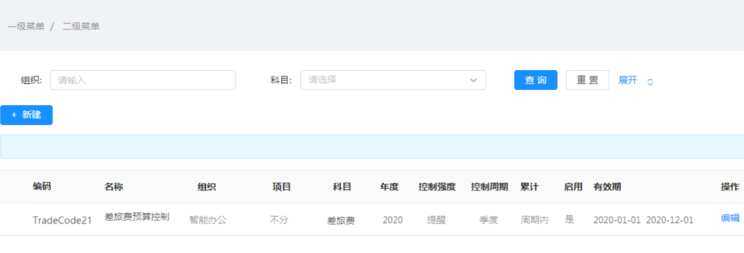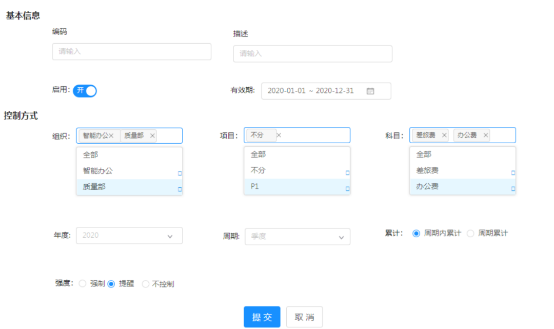 预算控制平台是依据预算编制结果及预算控制策略,对业务流程实施控制的平台。该平台通过设定组织、项目、预算科目、控制强度、控制周期、年份等维度组合,来定义控制业务流程的具体规则。