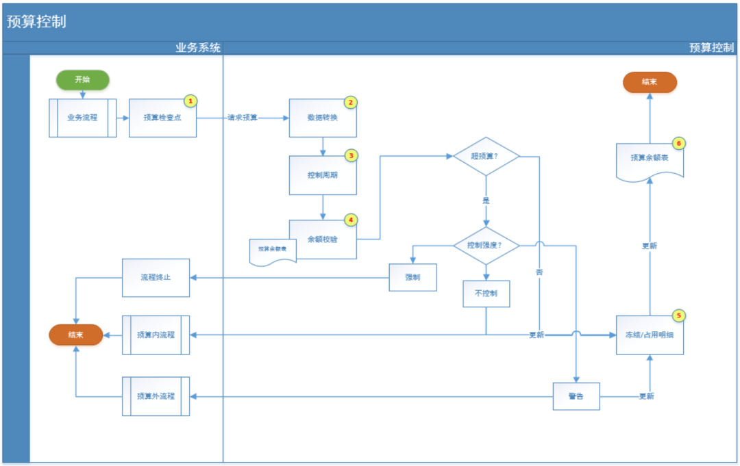 预算控制系统对同步过来的数据进行判断,若数据已存在,则进行更新;若数据不存在,则新增该数据。 05.预算控制流程 当业务系统流转至预算校验节点时,会通过“部门、科目、时间、金额”等参数,向预算控制平台发起预算控制服务请求。由于预算科目与核算科目编码不一致,预算控制平台会依据业务系统提供的参数及映射表进行数据转换。数据转换完成后,平台会根据这些参数查找相应的预算控制策略,如取款控制周期、累计控制等,以进行后续的预算控制处理。