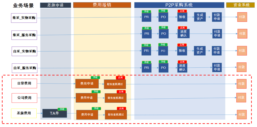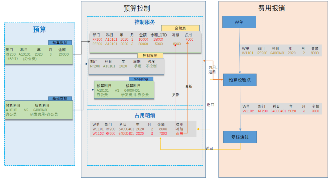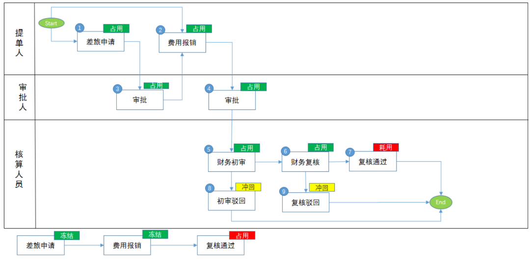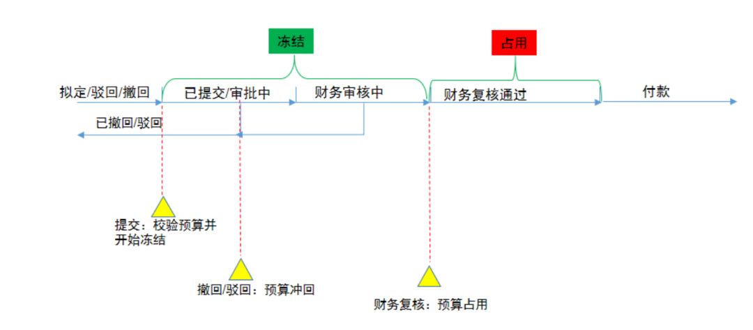 通过费用报销业务流程可以看出,预算控制并非一次性动作,而是需要在每个业务节点都进行相应的控制操作。例如,在申请时进行占用控制,通过时进行耗用控制,不通过时进行冲回控制等。