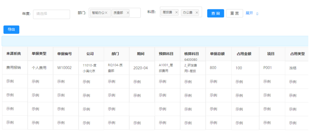 其中“组织、项目、科目、年度、期间、版本需唯一,不能重复”,需单独记录调拨中金额;预算原金额为从预算同步过来数据,记录预算版本,预算原金额不更新更改。 预算余额(YTD)=本季预算金额-本季冻结金额-本季占用金额; 预算金额的计算公式为:预算金额 = 预算原金额 - 调拨金额。 预算余额(QTD,即季度至今)的计算公式为:本月预算余额 = 本月预算金额 - 本月冻结金额 - 本月占用金额。 预算余额(YTD,即年至今)的计算公式为:本季预算余额 = 本季预算金额 - 本季冻结金额 - 本季占用金额。 07.冻结与占用明细 主要提供预算冻结和占用明细信息的查询服务。