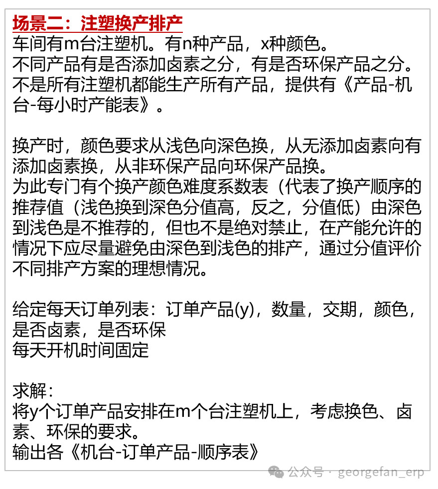 5. 输出结果 生成《机台-订单产品-顺序表》,包含每台机台的加工顺序及各订单的开始与结束时间。 数学模型(简化) ![]() ![]() ![]() 完整的数学模型的意义在于,可以找专业的求解器,将数学模型输入进去求解。 下面的内容才是令人绝望的: ![]() Deepseek的思考过程 用时251秒。 嗯,这个问题看起来挺复杂的。首先,我得仔细理解用户的需求。他们有一个注塑车间,有m台机器,需要生产n种产品,涉及x种颜色。每个订单有产品、数量、交期、颜色、是否含卤素、是否环保这些属性。然后换产的时候需要考虑颜色、卤素和环保这三个因素,换产顺序会影响清洗时间,进而影响总的生产时间。目标是把所有订单安排到各个机器上,让总的生产时间最短,同时还要满足那些换产的条件。 首先,我需要明确几个关键点。第一个是产品的属性:是否含卤素,是否环保。第二个是机器的兼容性,不是所有机器都能生产所有产品,所以得看产品-机台-产能表。第三个是换产时的顺序规则,颜色要从浅到深,卤素从无到有,环保从非到环保。这些顺序会影响换产的清洗时间,从而影响总时间。此外,换产颜色难度系数表可能给不同顺序的分值,比如从浅到深分高,反之低,但要尽量避免深到浅,除非产能允许的情况下。 接下来,如何将这些因素整合到排产模型中呢?可能需要建立一个优化模型,考虑每个机台上订单的加工顺序,使得总时间最短。这里的生产时间包括实际生产时间和换产清洗时间。因为换产顺序不同,清洗时间不同,所以需要动态地考虑这些因素。 首先,每个订单的生产时间可以用数量除以该产品在该机台的每小时产能得到。比如,订单数量是Q,机台产能是P,那么生产时间就是Q/P小时。然后换产时间取决于前后两个订单的属性差异。例如,如果前一个订单颜色深,后一个颜色浅,那么换产时间可能更长,或者可能不推荐,所以需要尽量避免。不过用户提到颜色难度系数表可能直接给出不同换产顺序的分值,但可能需要转换成实际的时间增量,或者作为优化目标中的惩罚项。 不过问题明确要求总生产时间最短,所以可能需要将换产的时间作为实际的时间消耗计算进去。也就是说,每个机台上订单的加工顺序的总时间等于每个订单的生产时间之和加上换产时间的总和。总目标是最小化所有机台完成时间的最大值,也就是完工时间(makespan)最小。 接下来,如何建模换产时间呢?可能要根据颜色、卤素、环保这三个属性的变化方向来计算。例如: - 颜色:浅色换到深色,换产时间较短;深色换到浅色,时间较长,或者可能需要更多的清洗时间。或者,换产时间可能根据颜色难度系数表来定,比如系数高的表示推荐顺序,对应时间短,反之时间长。所以需要将颜色难度系数转换为换产所需的时间。或者,可能该系数表直接给出了不同颜色转换的时间,比如从颜色A到颜色B的换产时间是多少。 但是用户提到的换产颜色难度系数表可能是一个推荐的分值,比如浅到深分高,反之分低。而目标可能是让总分值尽可能高,同时总生产时间尽可能短。不过用户的问题是要让总生产时间最短,所以可能需要将换产的时间作为实际时间计算,而分值可能作为约束或者辅助的优化目标。但问题中并没有明确换产难度系数如何转换为时间,可能需要假设每个换产步骤的清洗时间与这个系数相关,例如,系数高的换产时间短,反之长。或者,可能换产顺序如果符合推荐的方向,则清洗时间较短,否则较长。比如,颜色从浅到深,换产时间t1;反之,t2,其中t2 > t1。同样,卤素从无到有,换产时间t3;反之t4,可能t4 > t3。环保产品换产可能类似。那么总换产时间可能是这三部分的总和? 或者,换产的清洗时间可能由这三个因素中最严格的情况决定。比如,如果颜色转换需要更长的清洗时间,那么总换产时间就是颜色转换的时间加上其他两个因素的时间。或者,这三个因素可能共同影响换产时间,例如,当颜色转换方向不符合推荐时,时间增加,卤素方向不符合时也增加,环保方向不符合时同样增加。所以换产时间可能是一个基数值加上这三个因素带来的增量。 这里可能需要更多的信息,但用户并没有给出具体的数值,所以可能需要假设每个因素对换产时间的影响是独立的,并且可以累加。例如,每个不推荐的换产方向会增加一定的时间。例如,颜色从深到浅,增加a时间;卤素从有到无,增加b时间;环保从环保到非环保,增加c时间。总换产时间是基础时间加上这些增量。或者,换产时间可能由这三个因素中最严格的一个来决定,例如,颜色转换方向错误导致的时间增加最大,所以总换产时间由颜色转换的方向决定。 但用户提到有一个换产颜色难度系数表,可能仅针对颜色转换,而卤素和环保的换产顺序可能类似。比如,每个换产步骤的颜色转换有对应的分值,而卤素和环保也有类似的分值规则。但用户的问题中只明确提到了颜色难度系数表,可能其他两个因素的处理方式类似。 现在,我需要把问题分解为几个部分: 1. 确定每个机台可以生产哪些产品。根据产品-机台-产能表,每个产品只能在某些机台上生产,且每小时产能不同。 2. 确定订单分配到机台的可行性,即该机台是否能生产该订单的产品。 3. 对于每个机台上的订单序列,计算总生产时间(各订单生产时间的总和)和总换产时间(各相邻订单之间的换产时间总和)。总时间就是这两部分之和,每个机台的总时间