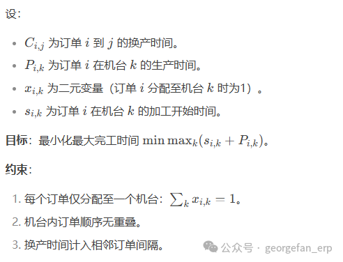 问题提出 ![]() Deepseek思考251秒,给出如下结果: 解决思路 该问题属于复杂的调度优化问题,需在满足换产顺序约束的前提下,将订单分配到各机台并优化加工顺序,以最小化总生产时间(最大完工时间)。以下是分步解决方案: 1. 数据预处理与建模