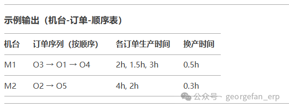 3. 单机台排序优化对每个机台的订单序列,采用启发式算法优化顺序,最小化换产时间总和: