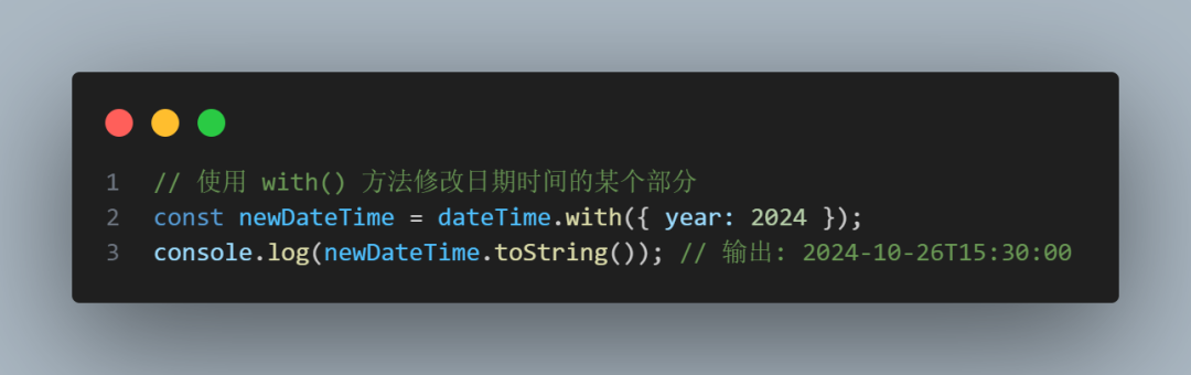 • 更友好的 API: Temporal 的 API 设计更加直观易用,例如可以使用 with() 方法轻松地修改日期时间的某个部分。