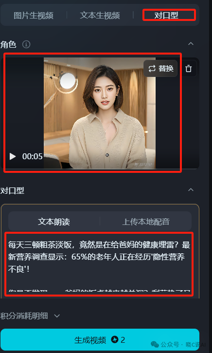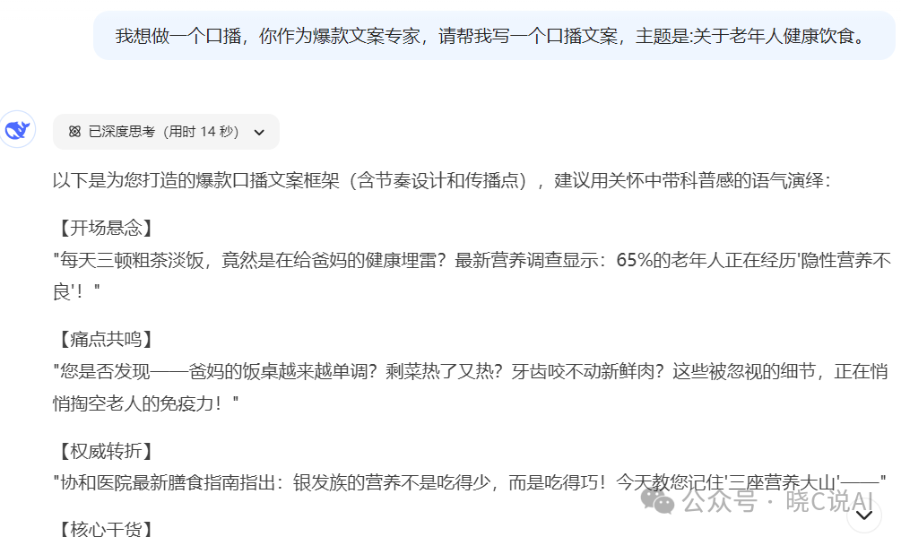 1.打开DeepSeek,让DS帮我们生成口播文案。输入提示词:我想做一个口播,你作为爆款文案专家,请帮我写一个口播文案,主题是:关于老年人健康饮食。这里可以看到 Deepseek 能迅速帮我们写出文案,把文案整理好以便后用。2.打开即梦AI,使用视频生成--图片生视频。这里选择自己的照片或者用工具生成的照片也行的。我这里使用的是AI生成的照片。并在下面:结合图片,描述你想生成的画面和动作。输入:镜头缓慢环绕,人物要自然真实,呈现看镜头正在讲课的感觉,画面不模糊不扭曲变形把生成的视频下载保存到本地。注意:这个时候的视频是没有声音的。3.继续使用即梦AI。因为我们是让数字人能说出我们想要的内容。这个时候需要使用即梦AI的对口型,然后,上传上一步生成的视频,再加上DeepSeek生成的文案。等设置好后,再点击“生成视频”按钮,这样数字人视频就制作完成啦,是不是很简单的,你可以自己动手试下哦。