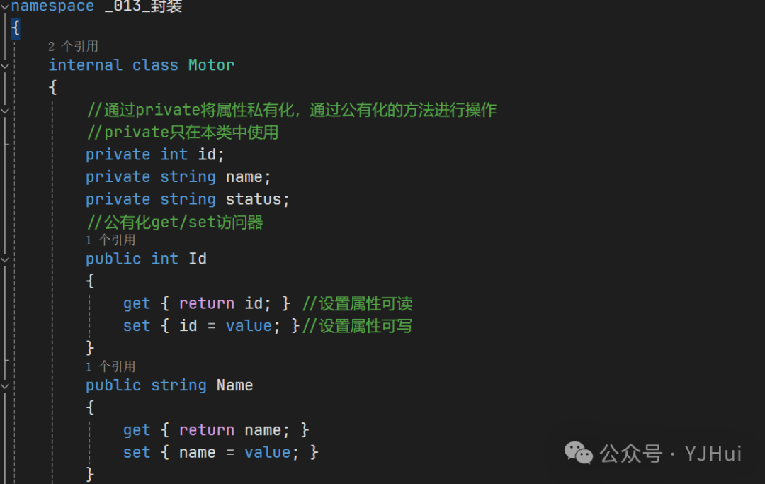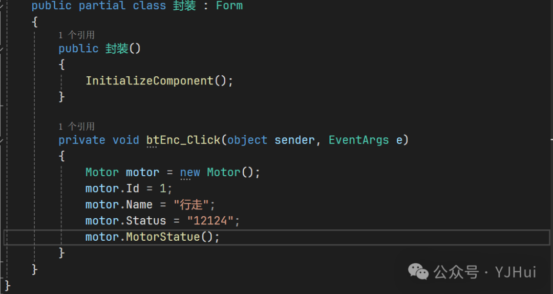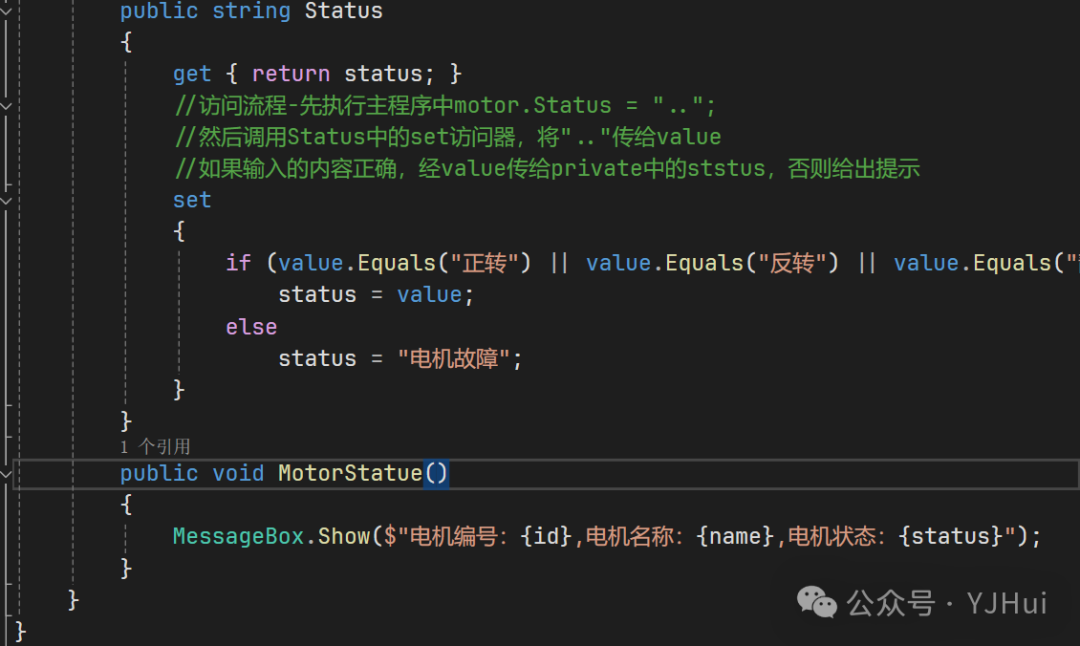 namespace _013_封装{ internal class Motor { private int id; private string name; private string status; public int Id { get { return id; } set { id = value; } } public string Name { get { return name; } set { name = value; } } public string Status { get { return status; } set { if (value.Equals("正转") || value.Equals("反转") || value.Equals("静止")) status = value; else status = "电机故障"; } } public void MotorStatue() { MessageBox.Show($"电机编号:{id},电机名称:{name},电机状态:{status}"); } }}
