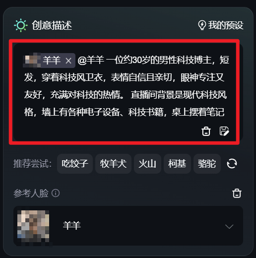 在左上角的创意描述区域,使用“羊羊”的人脸,并进行详细描述,