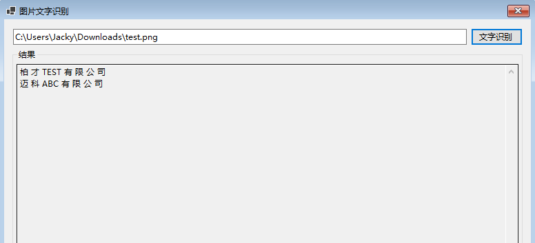 运行程序,输入图片路径,点击 "文字识别" 按钮,很快地就自动识别出图片上的文字,并输出结果,如下图: