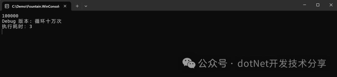 using System.Diagnostics;namespace Fountain.WinConsole.BuildTypesDemo{ internal class Program { static void Main(string[] args) { // 用于计时 Stopwatch stopwatch = new Stopwatch(); stopwatch.Start(); int j = 0; for (int i = 0; i < 100000; i++) { j = j + i; } Console.WriteLine($"{j}");#if DEBUG // 此行代码仅在选择 Debug 版本时运行。这样,就可以在不影响 Release 构建的情况下添加调试代码。 Console.WriteLine("Debug 版本: 循环十万次");#endif stopwatch.Stop(); // Console.WriteLine(string.Format("执行耗时:{0}", stopwatch.ElapsedMilliseconds)); // Console.Read(); } }}