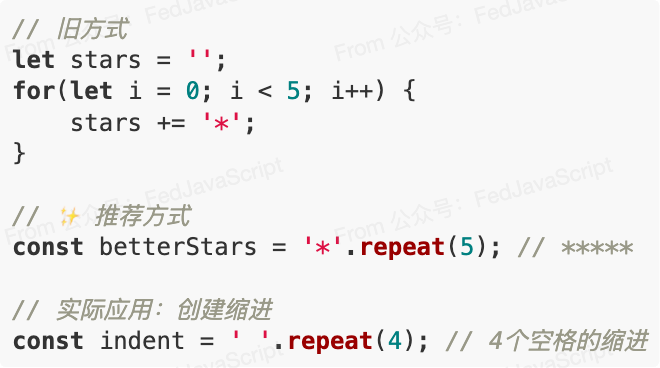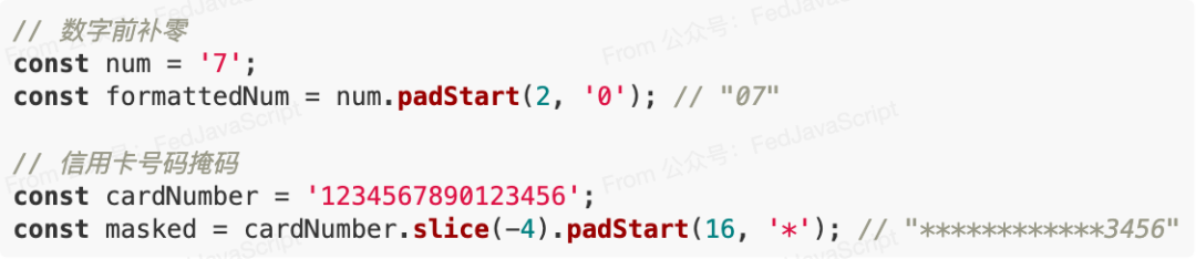 4. 字符串填充在处理数字格式化、创建固定长度的字符串时,padStart()和padEnd()特别有用: