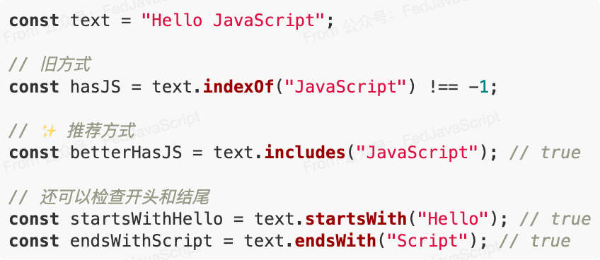 5. 字符串搜索的改进方案在检查字符串是否包含特定内容时,includes()比indexOf()更直观: