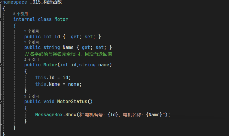 namespace _015_构造函数{ internal class Motor { public int Id { get; set; } public string Name { get; set; } public Motor(int id,string name) { this.Id = id; this.Name = name; } public void MotorStatus() { MessageBox.Show($"电机编号:{Id},电机名称:{Name}"); } }}
