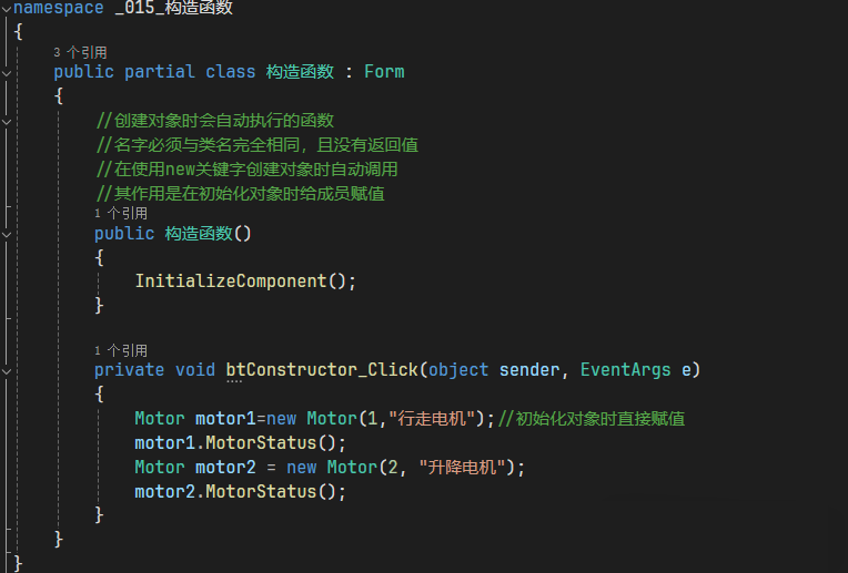 private void btConstructor_Click(object sender, EventArgs e) { Motor motor1=new Motor(1,"行走电机"); motor1.MotorStatus(); Motor motor2 = new Motor(2, "升降电机"); motor2.MotorStatus(); } }}