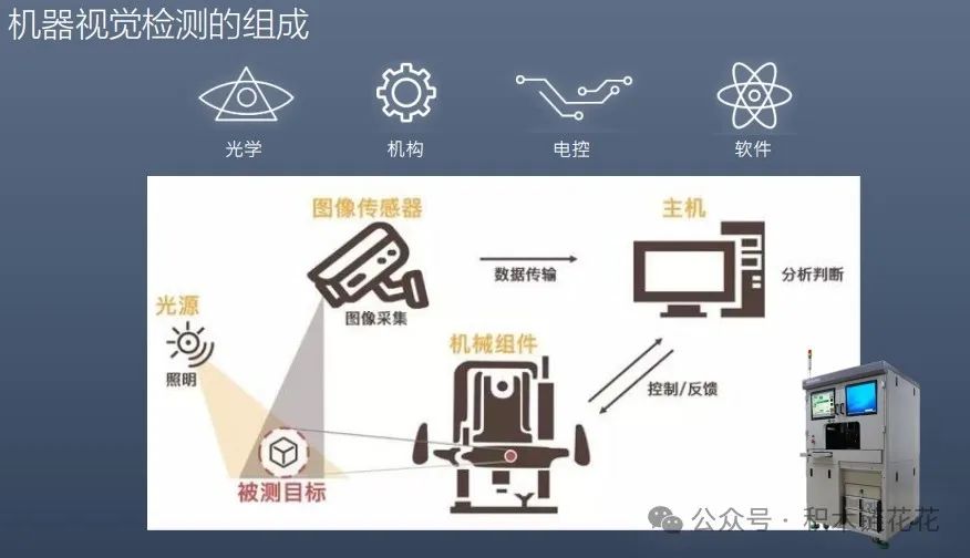 光学系统 相机:相机是图像采集的核心部件,决定了图像的分辨率、色彩还原等参数。 镜头:镜头的作用是将物体的图像投射到相机的传感器上,影响视野和成像质量。 光源:良好的光源能够确保拍摄到清晰的图像。不同的产品或检测需求,可能需要不同类型的光源(如LED光源、激光光源等)。 机构系统主要负责产品的输送、检测和分拣任务。它通过机械手臂、传送带等设备,确保物料的流动和检测过程的顺利进行。 上料动作:通过物料引导机构、物料夹取机构等设备将产品送入检测区。 检测动作:利用移动机构将物品带到检测位置,进行自动化检测。 下料动作:检测完成后,将合格品或不良品分拣并移出检测区。 电控系统电控系统负责控制机器视觉检测设备的运行,包括相机、光源、移动机构等部件的协调工作。电控系统确保整个检测过程按照预定程序高效稳定地进行。 软件系统是机器视觉检测的“大脑”,其作用是对采集到的图像进行处理、分析和判断。软件系统的核心包括: 图像预处理:对原始图像进行去噪、增强、边缘提取等处理,以提高后续分析的准确性。 检测算法:通过模板匹配、缺陷检测、几何测量等算法,判断图像是否符合标准。 深度学习算法:通过AI技术,机器视觉系统可以自我学习、优化,提升检测准确率。