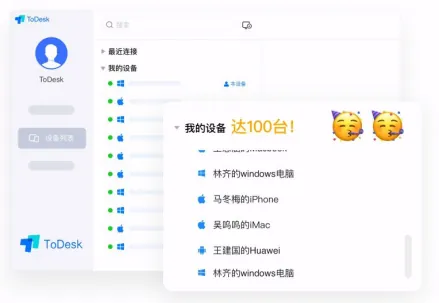 设备支持一百台 ToDesk 设备列表容量高达100台,用于同步保存用户经常远程控制的计算机设备,支持更高效灵活地管理多台办公设备。