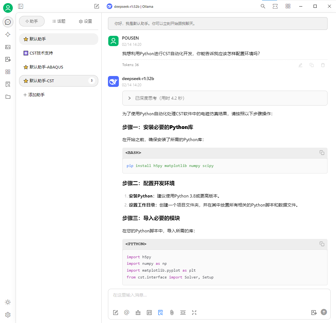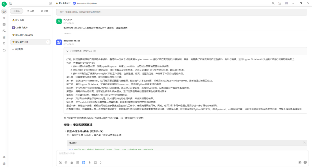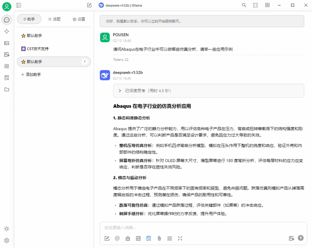 目前,我们已经在公司的高性能服务器上完成了本地 AI 智能助手部署的 demo,通过大参数量的 DeepSeek 本地大模型(70b 及以上)与丰富的本地知识库相结合,成功创建了 “虚拟 CST/ABAQUS 技术支持工程师” 这一 AI 智能体,验证了 AI 模型 + 行业本地知识库在业务中的实际运用效果。
