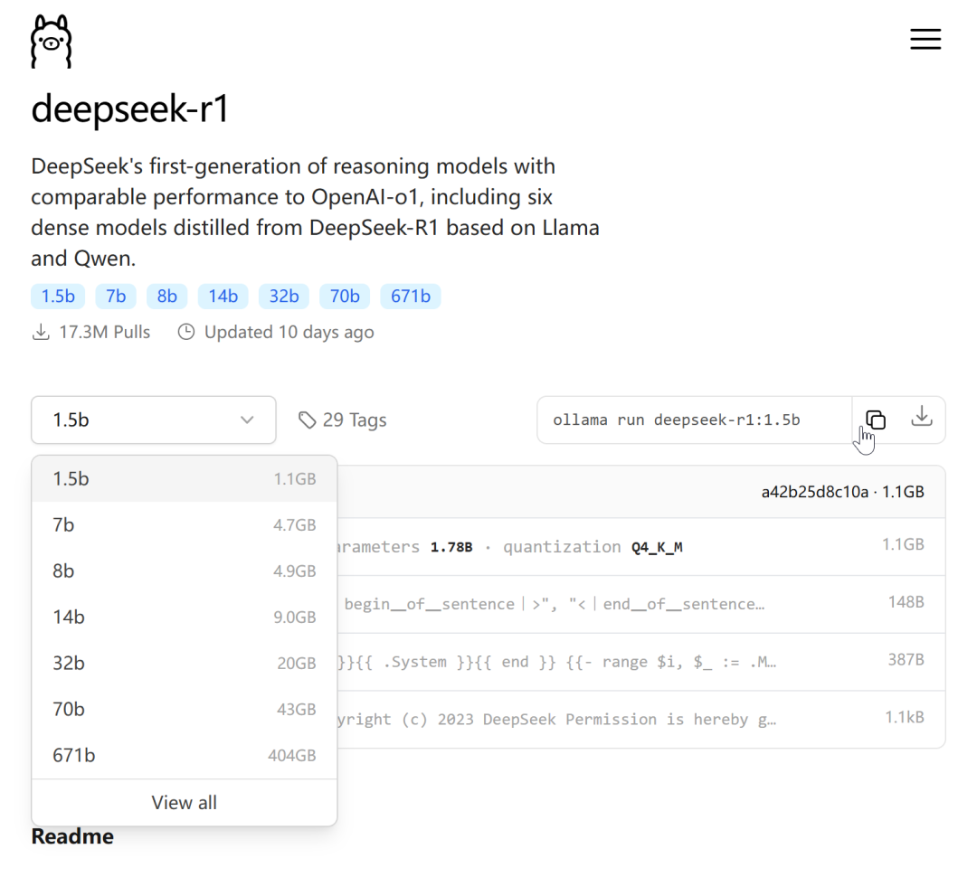 2、在 Ollama 模型列表中复制命令ollama run deepseek-r1:1.5b,粘贴到命令行中,等待下载完成。
