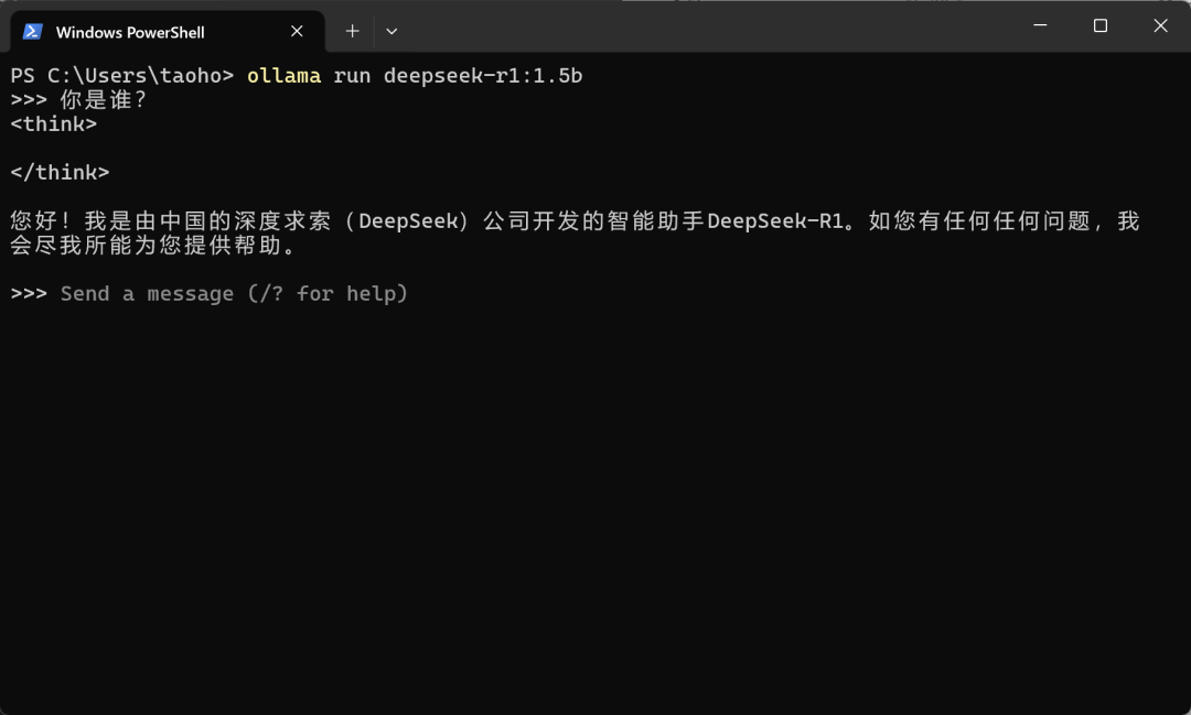 下载完成后,可直接在命令行中与模型对话,检查模型能否正常加载。