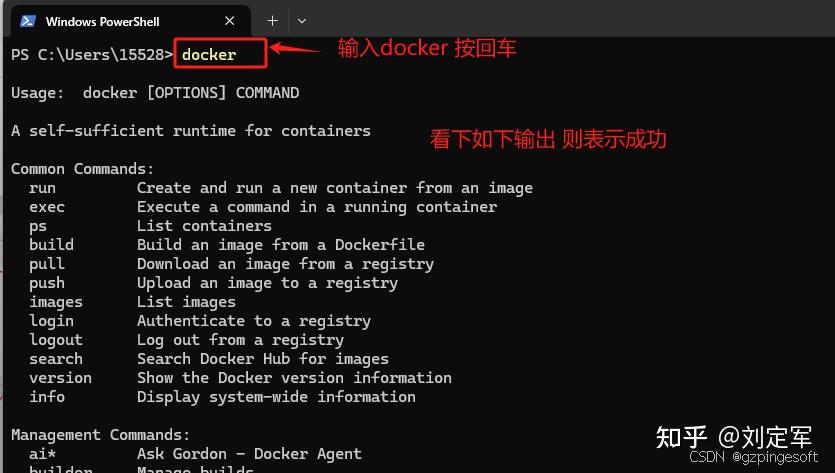 检查Docker 安装是否成功按windos键+r 打开终端控制台 输入docker,按回车,如有如下输出信息则表示docker安装成功。
