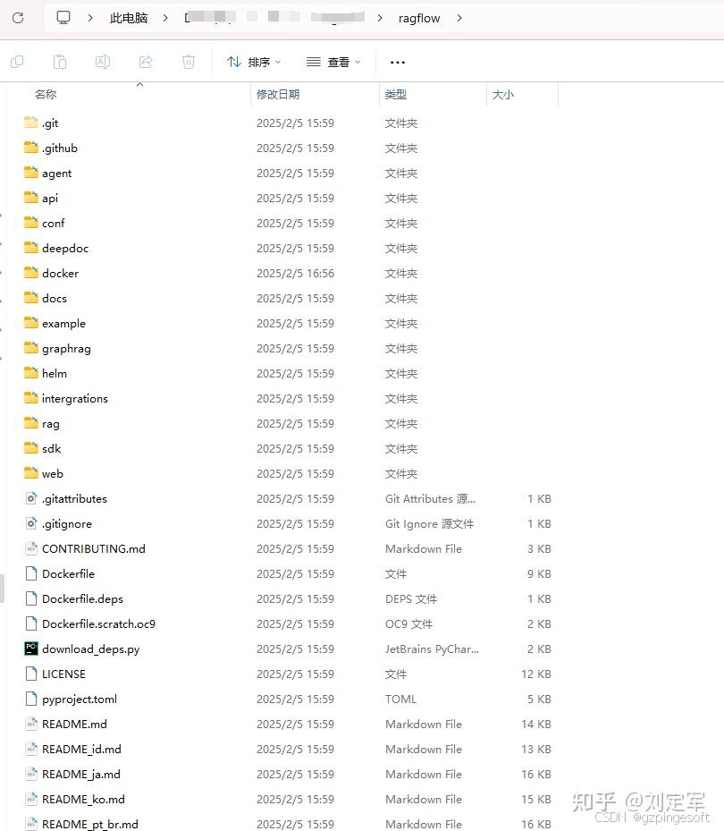 注,如不能识别git ,请先下载git 工具。 下载RAGFlow 后,在本机将会看到如下文件: