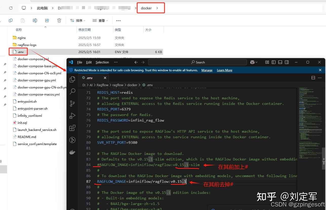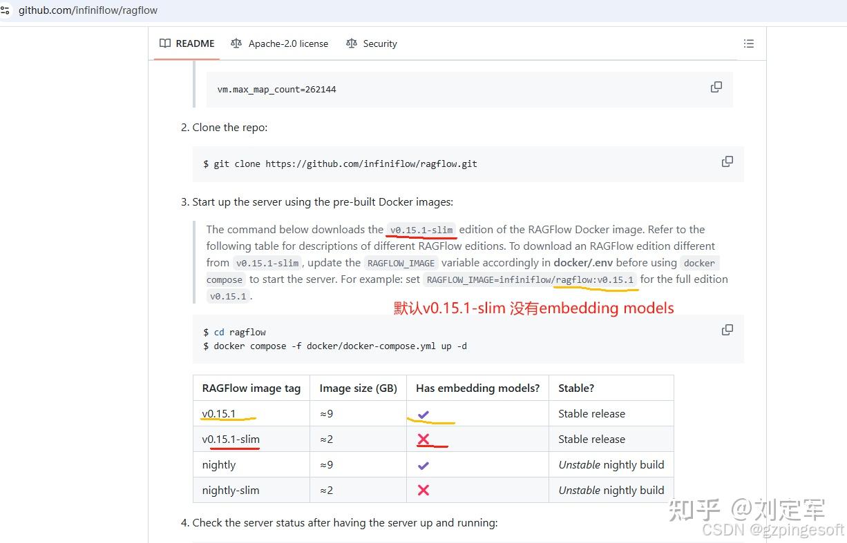 3. RAGFlow 配置RAGFlow配置 RAGFlow Docker 镜像默认v0.15.1-slim 没有embedding models,所以使用v0.15.1,需要修改配置。