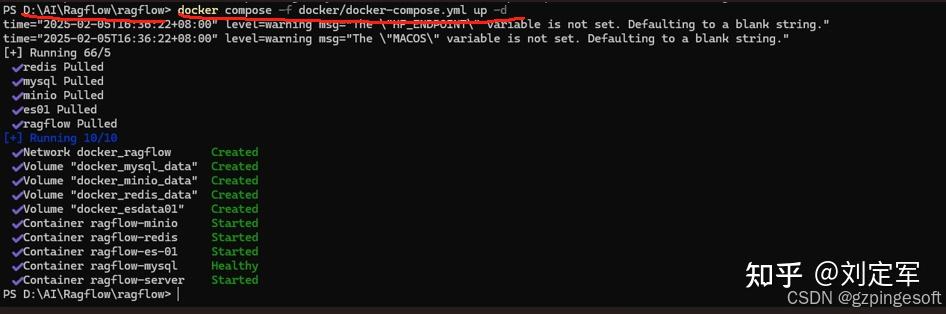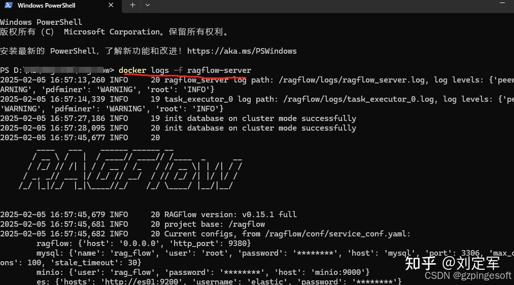完成后输入docker logs -f ragflow-server 如果看到如下信息 则启动成功: