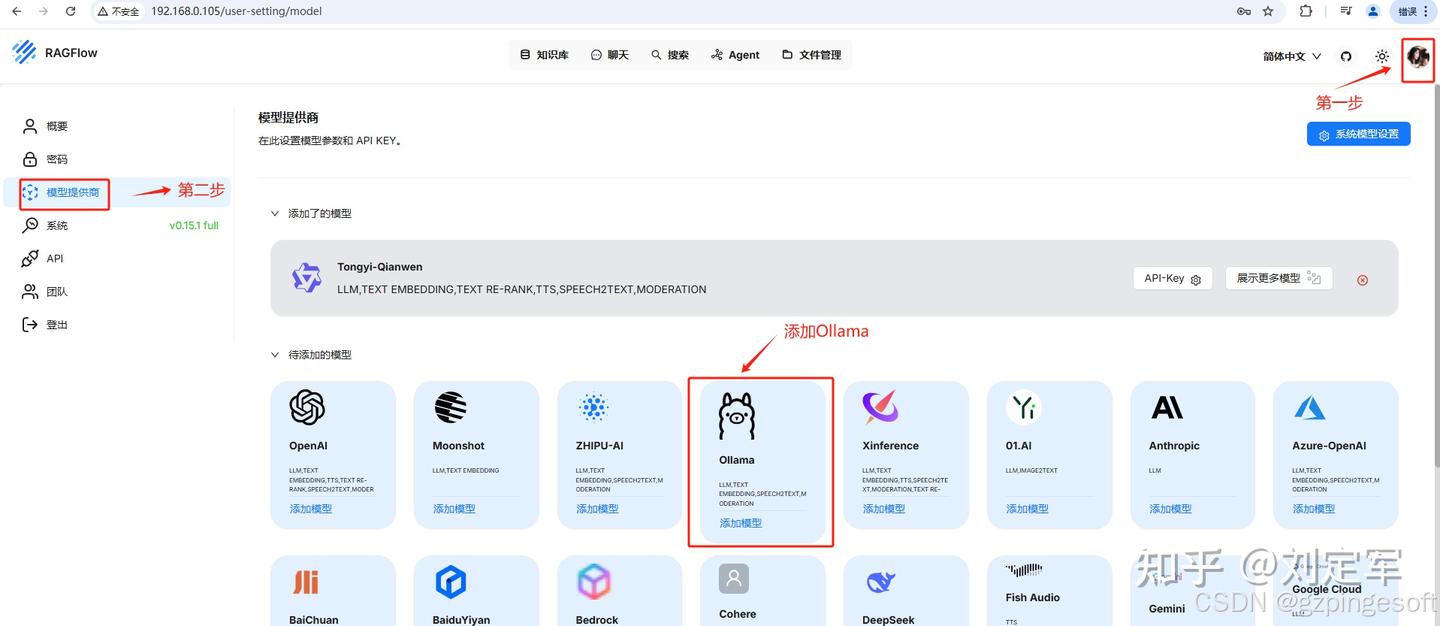 注意 首次注册的用户则是系统管理员。 登录后,如下图操作,添加Ollama