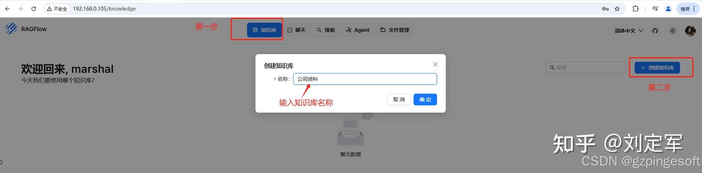 至些构建知识库的前置工作已完成,接下来实战体验知识库。 4.新建知识库点击知识库,点击新建知识库,如下图,创建知识库
