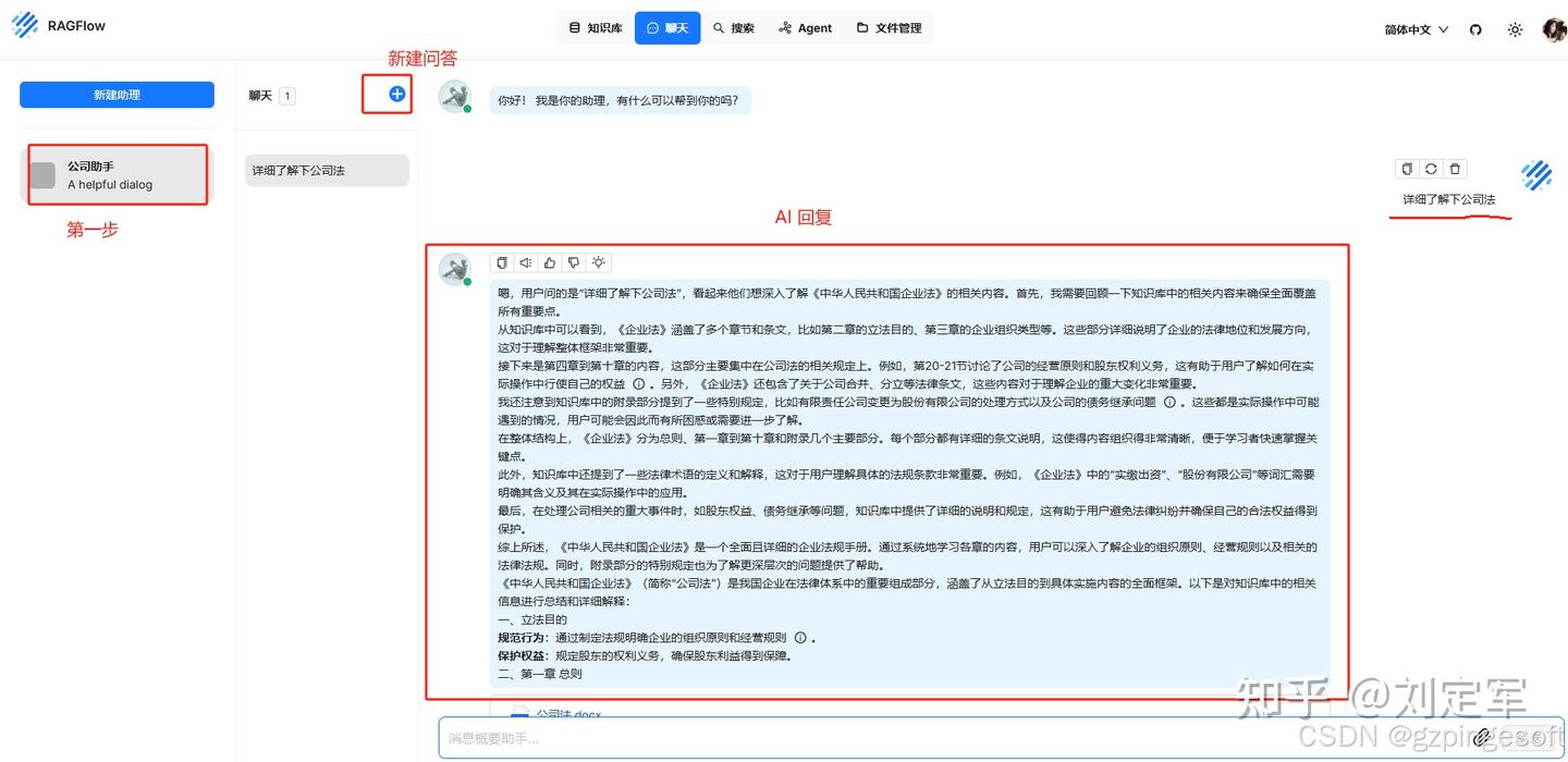 知识库测试在聊天页,新建问答,进行知识库测试,如下图