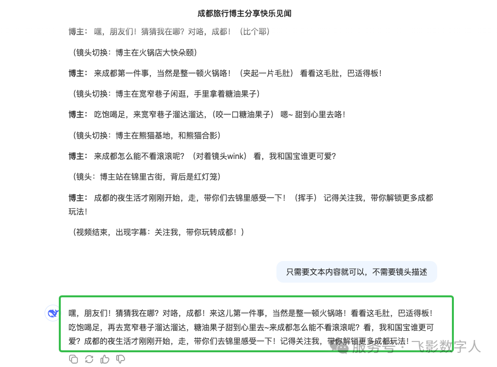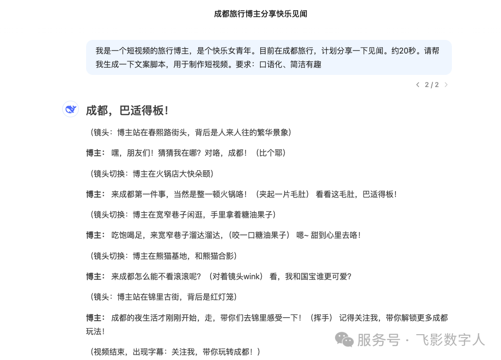 - 提示词1:我是一个短视频的旅行博主,是个快乐女青年。目前在成都旅行,计划分享一下见闻。请帮我生成一下文案脚本,用于制作短视频。要求:口语化、简洁有趣