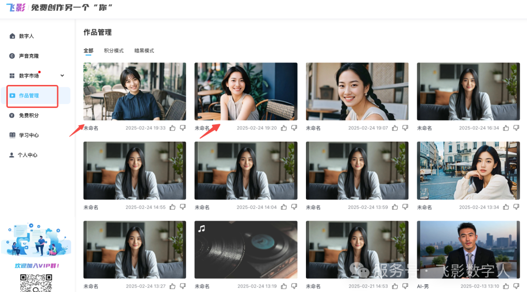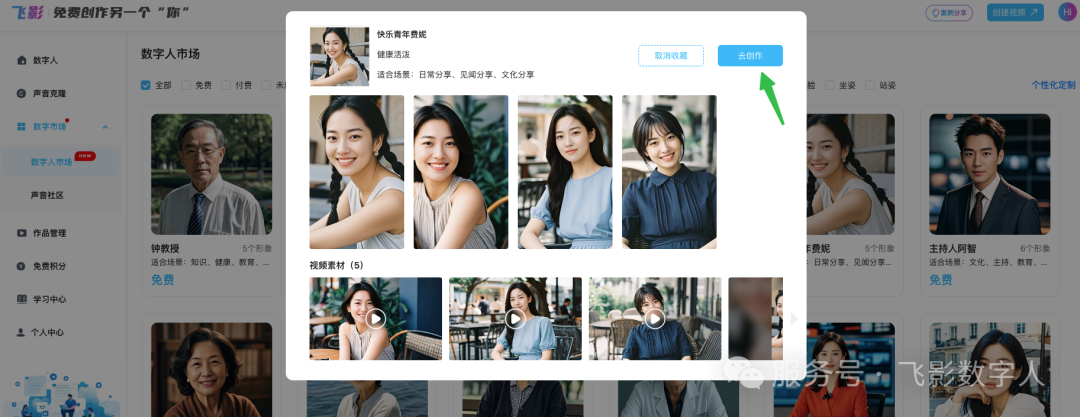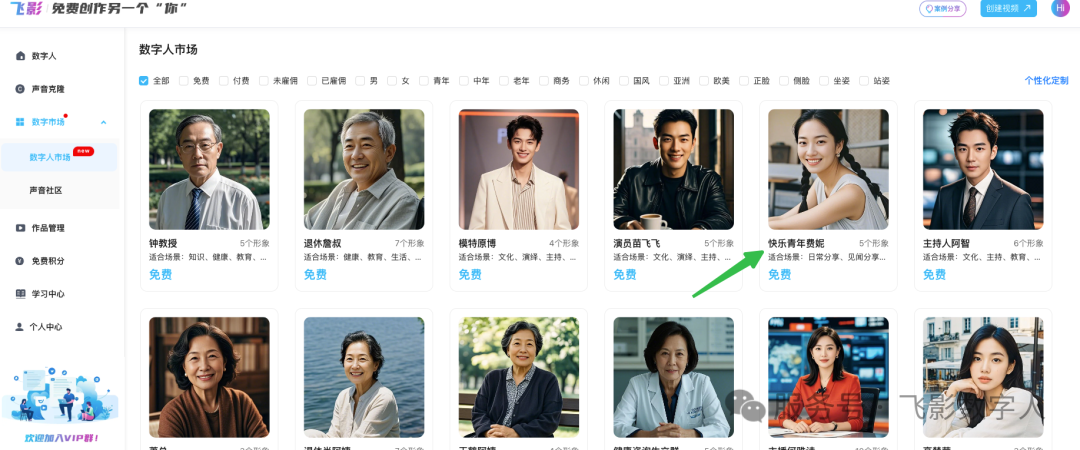 比如,在数字人市场选择免费的 “快乐青年费妮