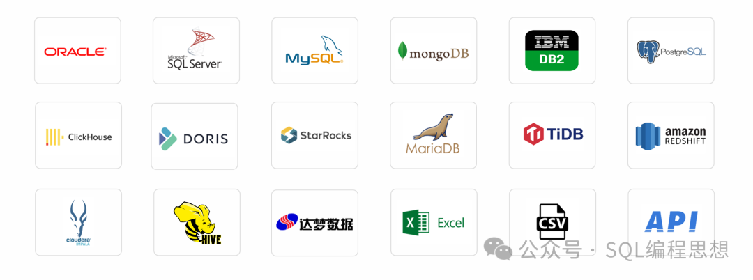 - OLTP 数据库: MySQL、Oracle、SQL Server、PostgreSQL、MariaDB、Db2、TiDB、MongoDB-BI 等;