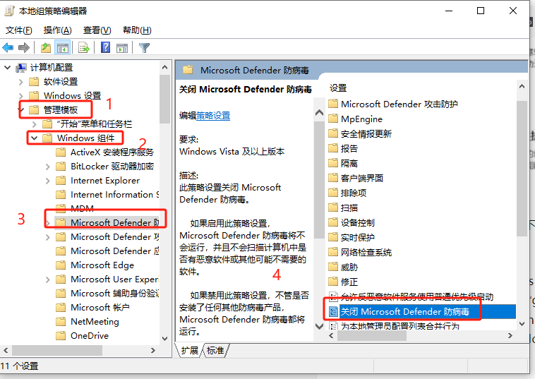 按 “Windows键+R”,输入 “gpedit.msc” ,回车启动组策略编辑器。打开 “计算机配置”>“管理模板”>“Windows组件”>“Windows Defender 防病毒程序”,在右侧双击 “关闭Windows Defender 防病毒程序”,将状态改为“已启用”,重启电脑。二、如果是家庭版 Windows 10/11:
