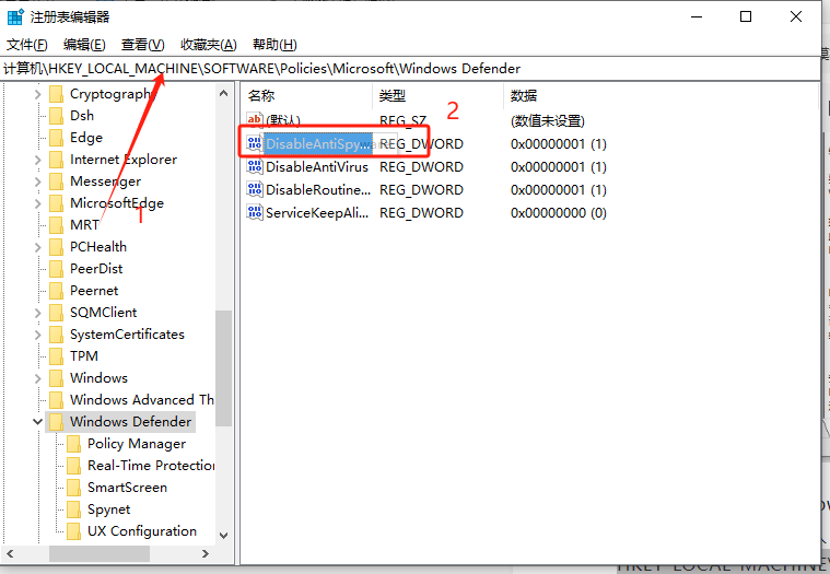 按 “Windows键+R,输入 “regedit”,回车启动注册表编辑器。定位到 HKEY_LOCAL_MACHINE\SOFTWARE\Policies\Microsoft\Windows Defender,新建一个 DWORD 项,命名为 DisableAntiSpyware ,双击该项后值设 0 为开启,1 为关闭 Windows 安全中心。重启电脑之后,就可以彻底关闭Windows defender了!