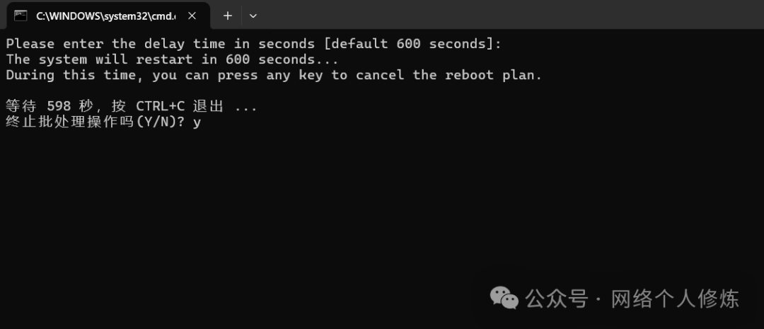 风险提示:运行后按任意键立即重启 ![]() 脚本2:增强脚本 为了增加灵活性并防止误操作,下面是一个改进版的脚本,允许设置延迟时间并在期间取消重启计划: