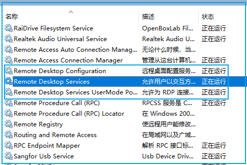 有,通过重启远程桌面服务的形式可以不用重启系统就使配置生效。与远程桌面相关的服务有:一般重启中间的那个就可以,它们之间有依赖关系。实际服务对应的服务名为:
